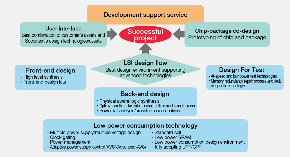 透過客戶的設計資源與Socionext的設計能力和技術,以最佳的方式融合在一起,成功提高SoC開發專案的效率。此外,Socionext還提供融合上層驗證和FPGA原型製作的設計流程,進一步提升專案品質,縮短研發週期。
